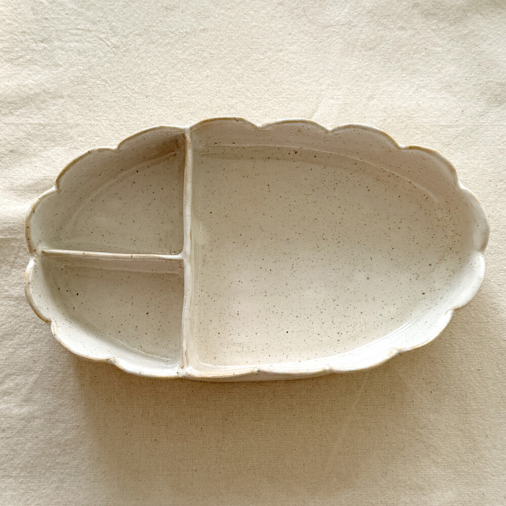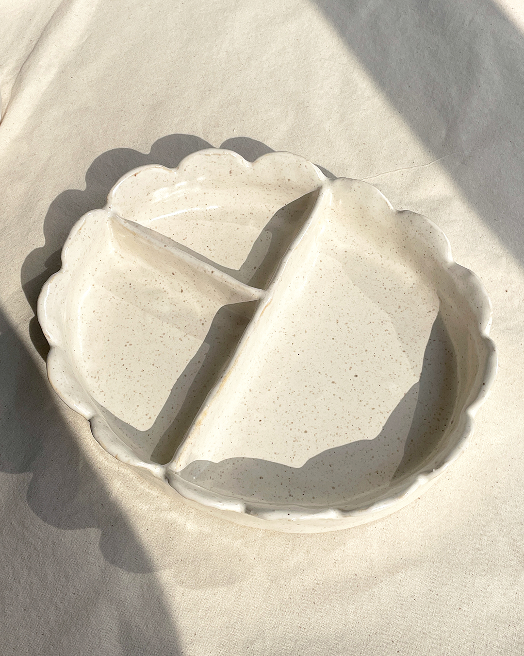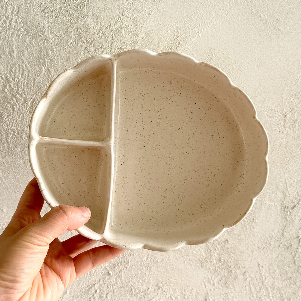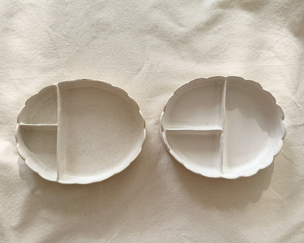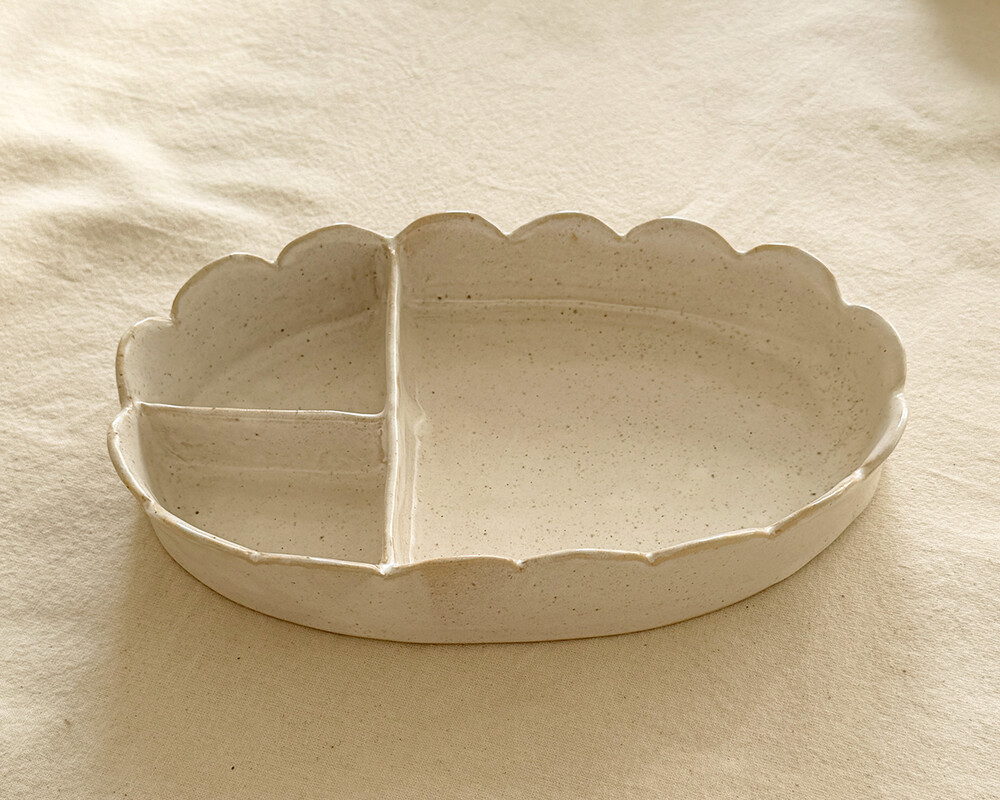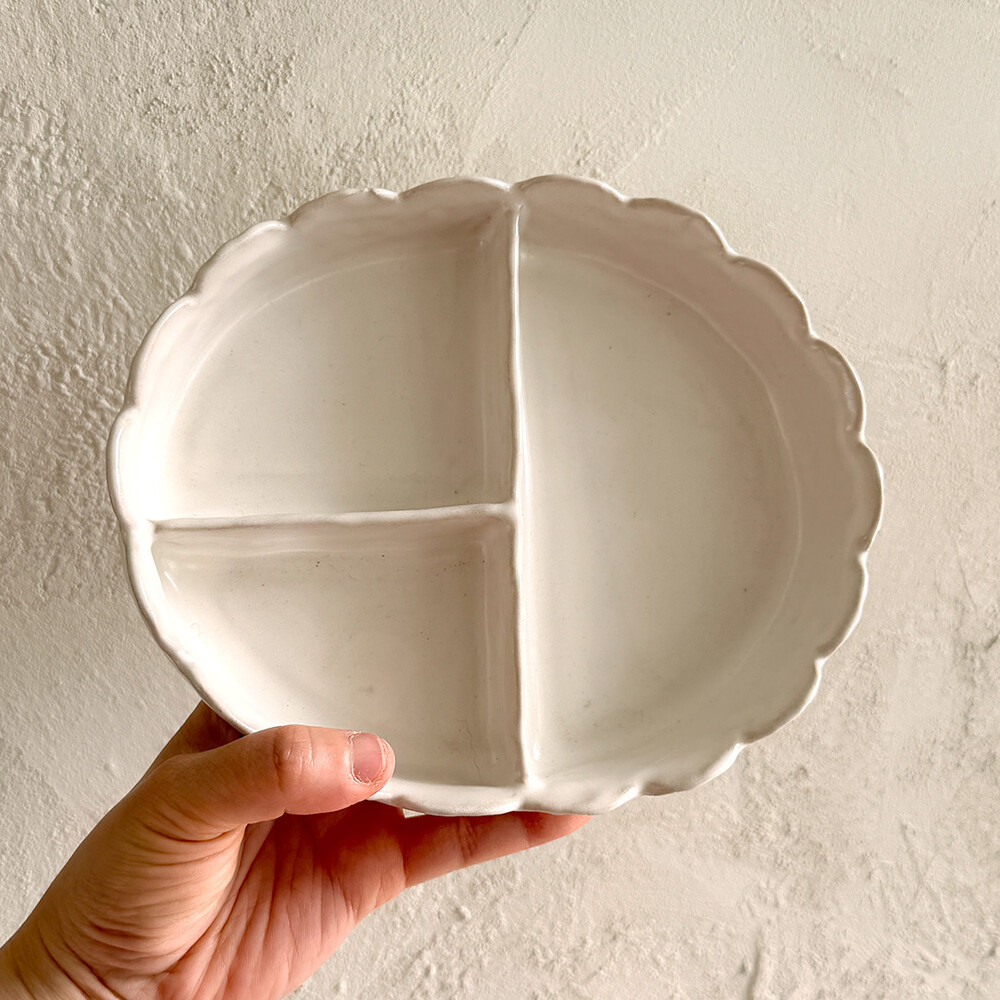 신제품 애프터눈 가든 플래터 L 와 같은 사이즈로 나눠진 칸의 크기가 각각 다르고 화이트 색상입니다.
