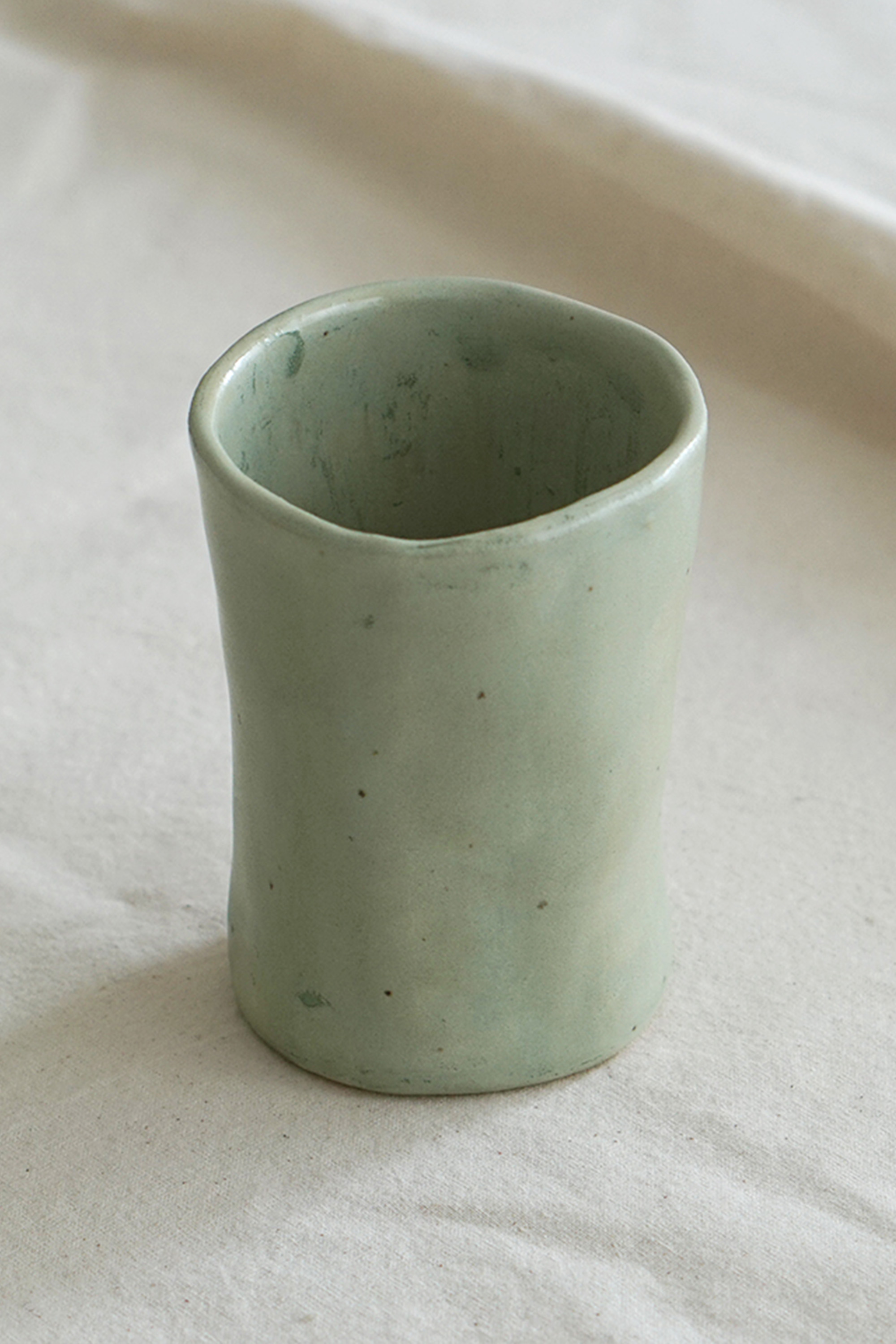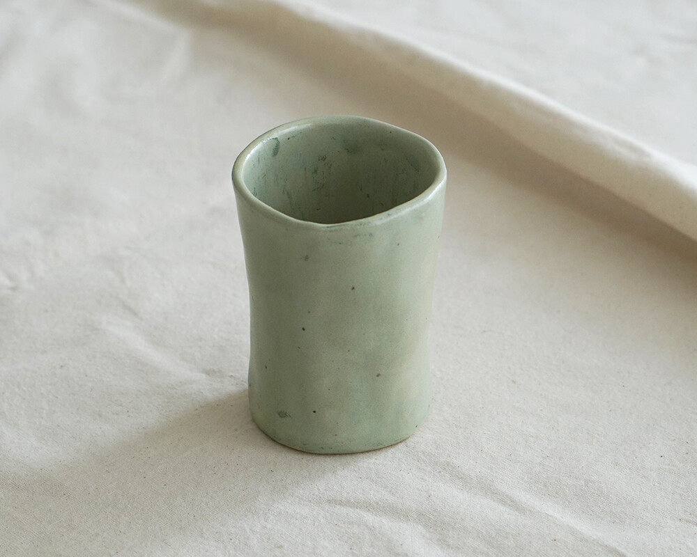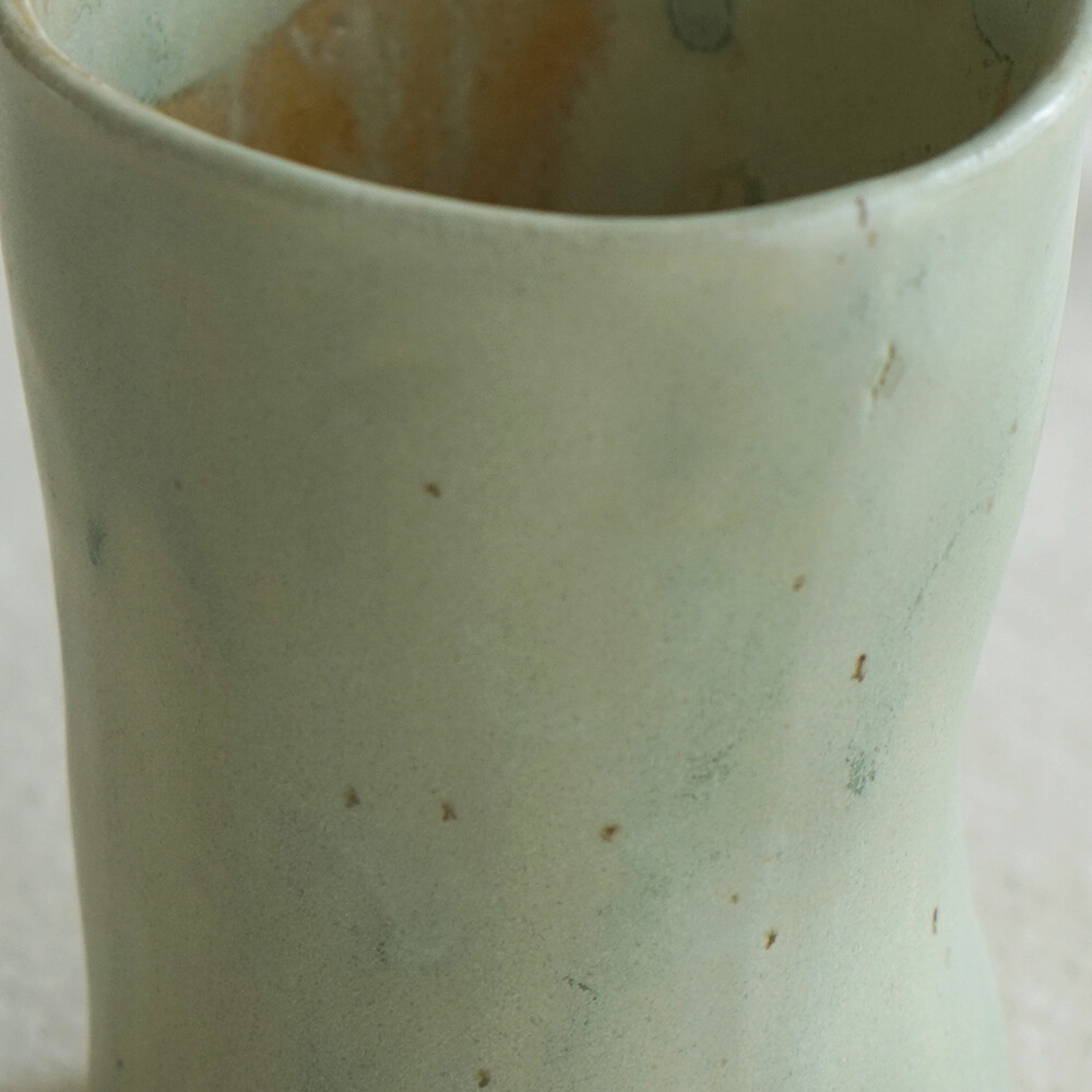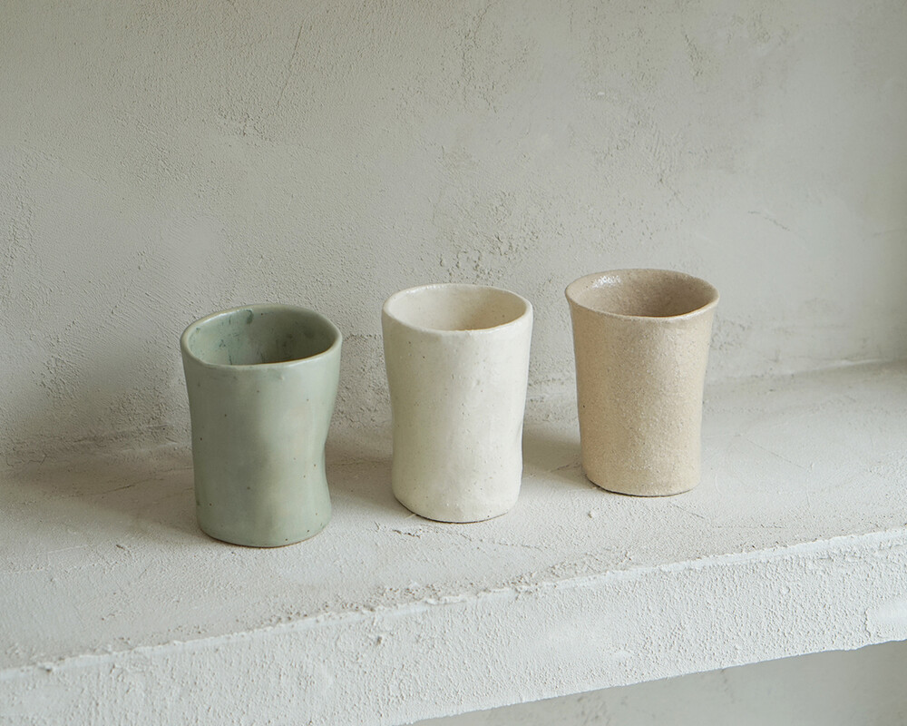 전체적으로 길쭉한 실루엣에 의도적으로 흐트러진 듯한 비대칭 라인이 매력적입니다. 손으로 빚은 자국이 자연스럽게 남아 있어 각각의 컵이 조금씩 다른 형태를 가지고 있습니다.