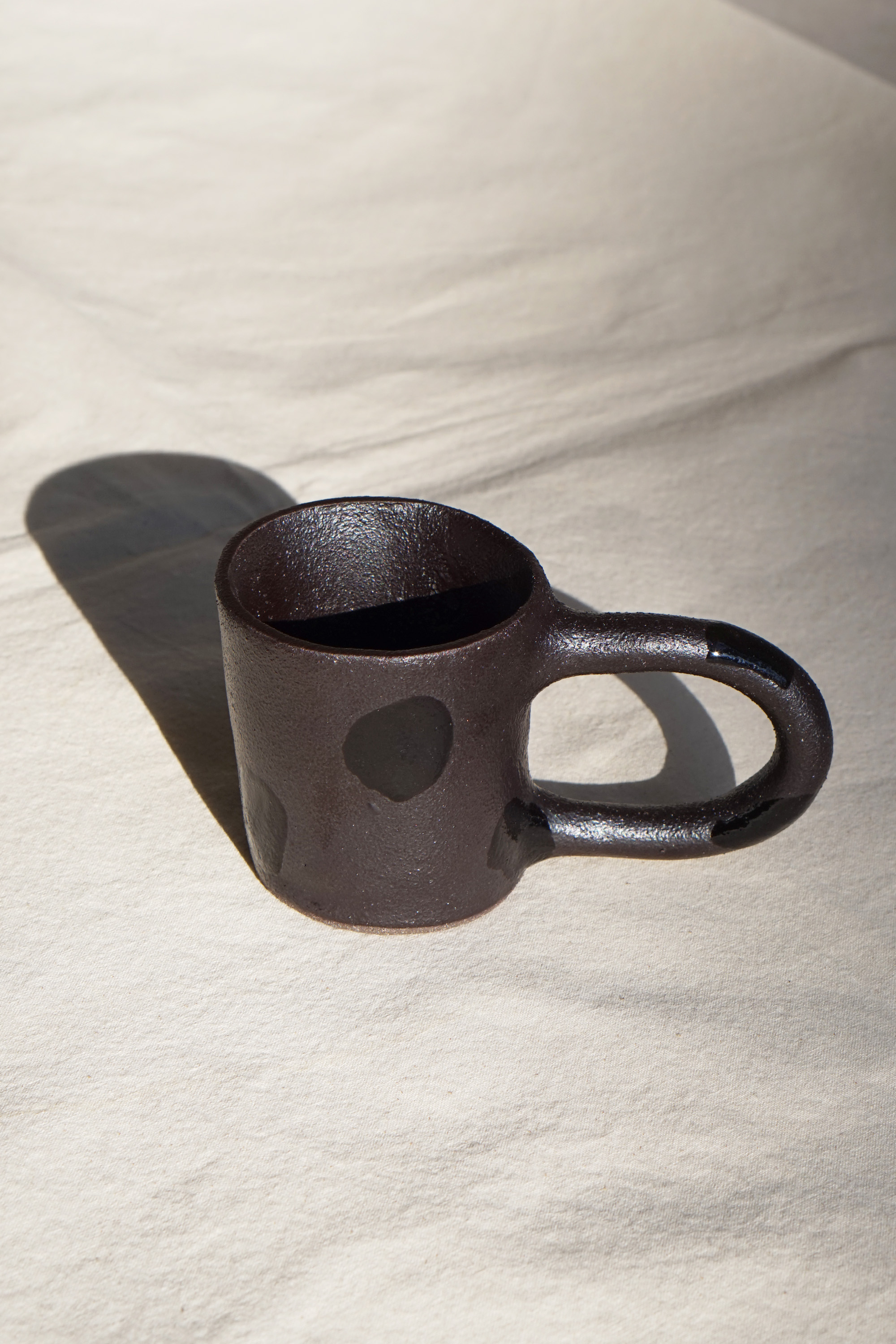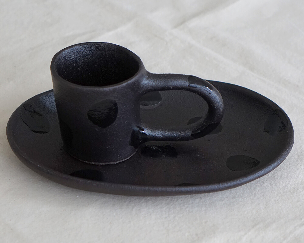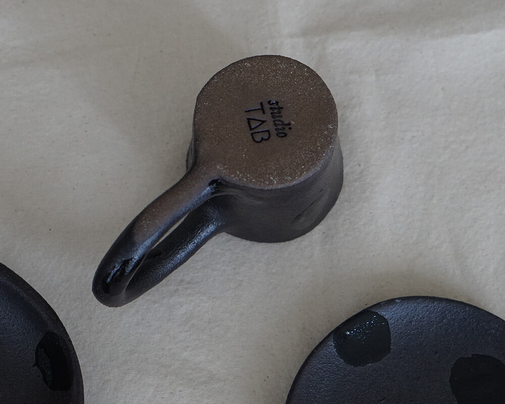 거칠고 투박한 텍스처 위에 차분한 매트 블랙 유약을 얇게 입히고, 그 위로 무심하게 붓끝이 지나간 글로시한 패턴을 더했습니다.