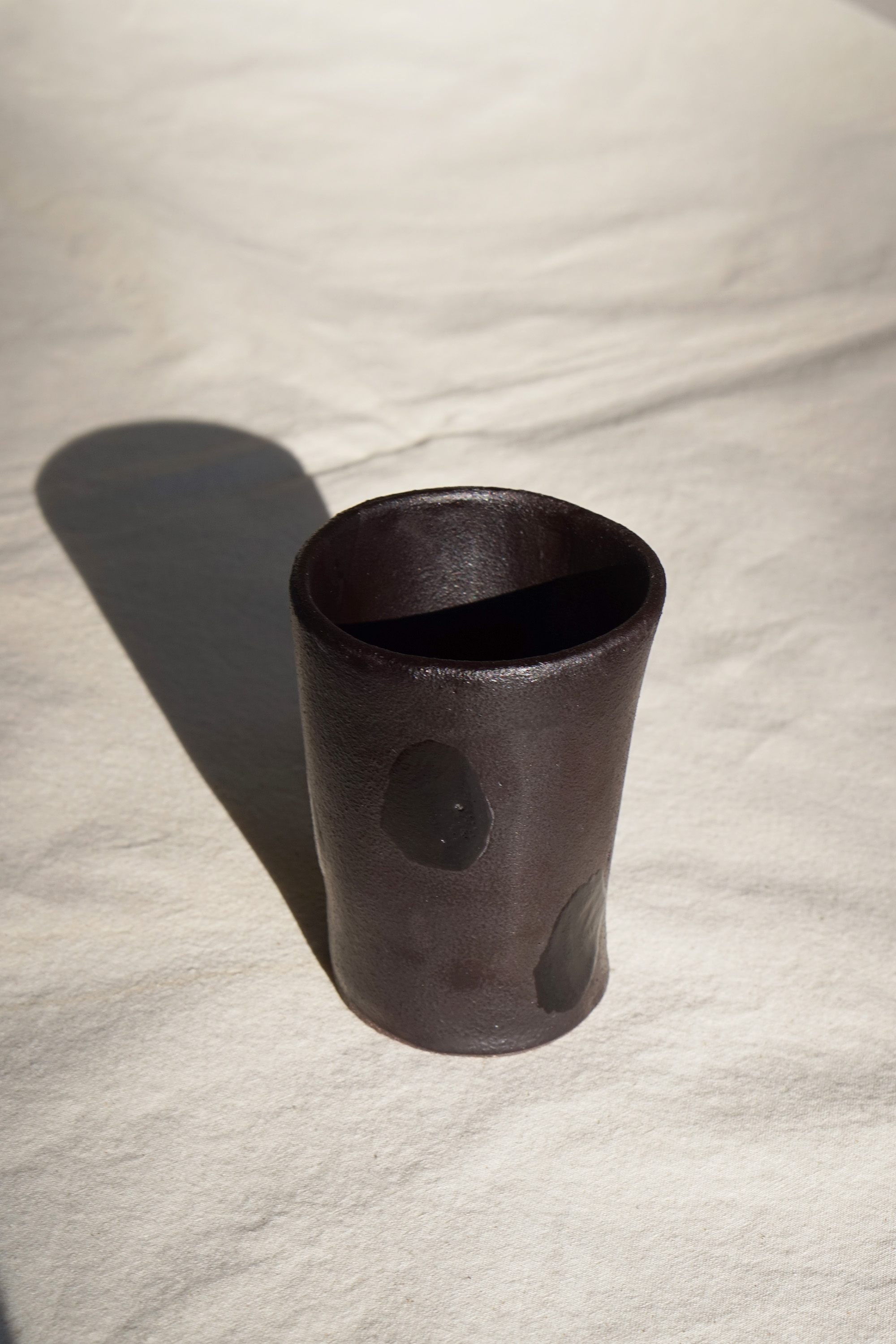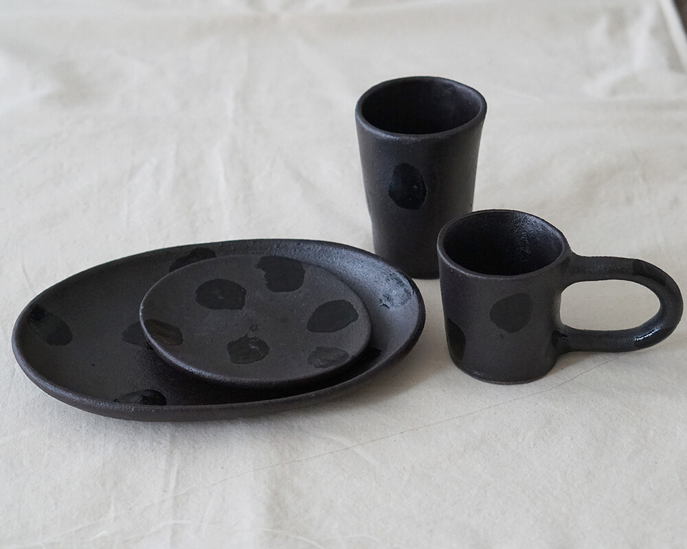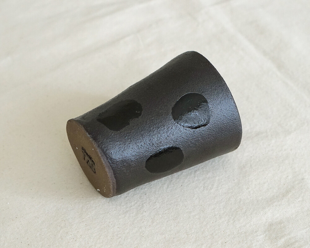 거칠고 투박한 텍스처 위에 차분한 매트 블랙 유약을 얇게 입히고, 그 위로 무심하게 붓끝이 지나간 글로시한 패턴을 더했습니다.