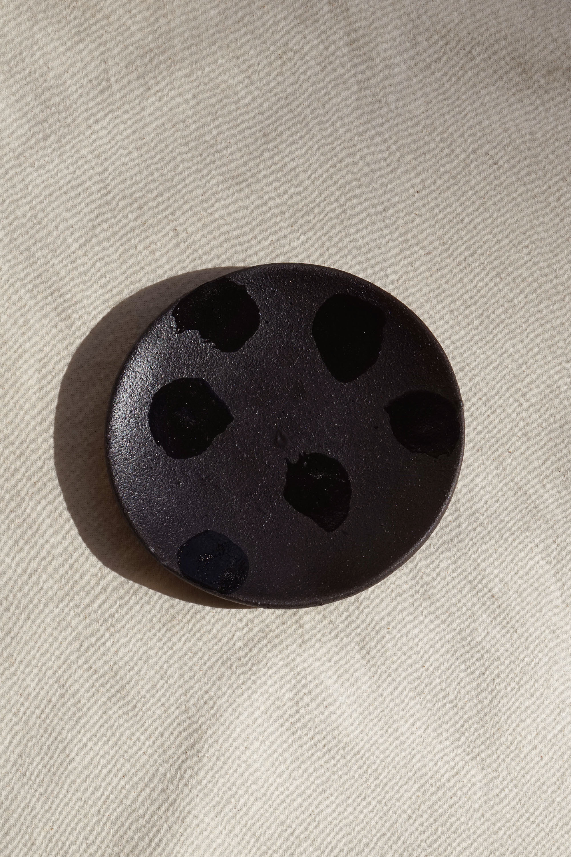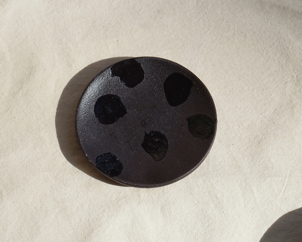 거칠고 투박한 텍스처 위에 붓으로 무심한 듯 그린 패턴이 특징인 미니 라운드 플레이트입니다.