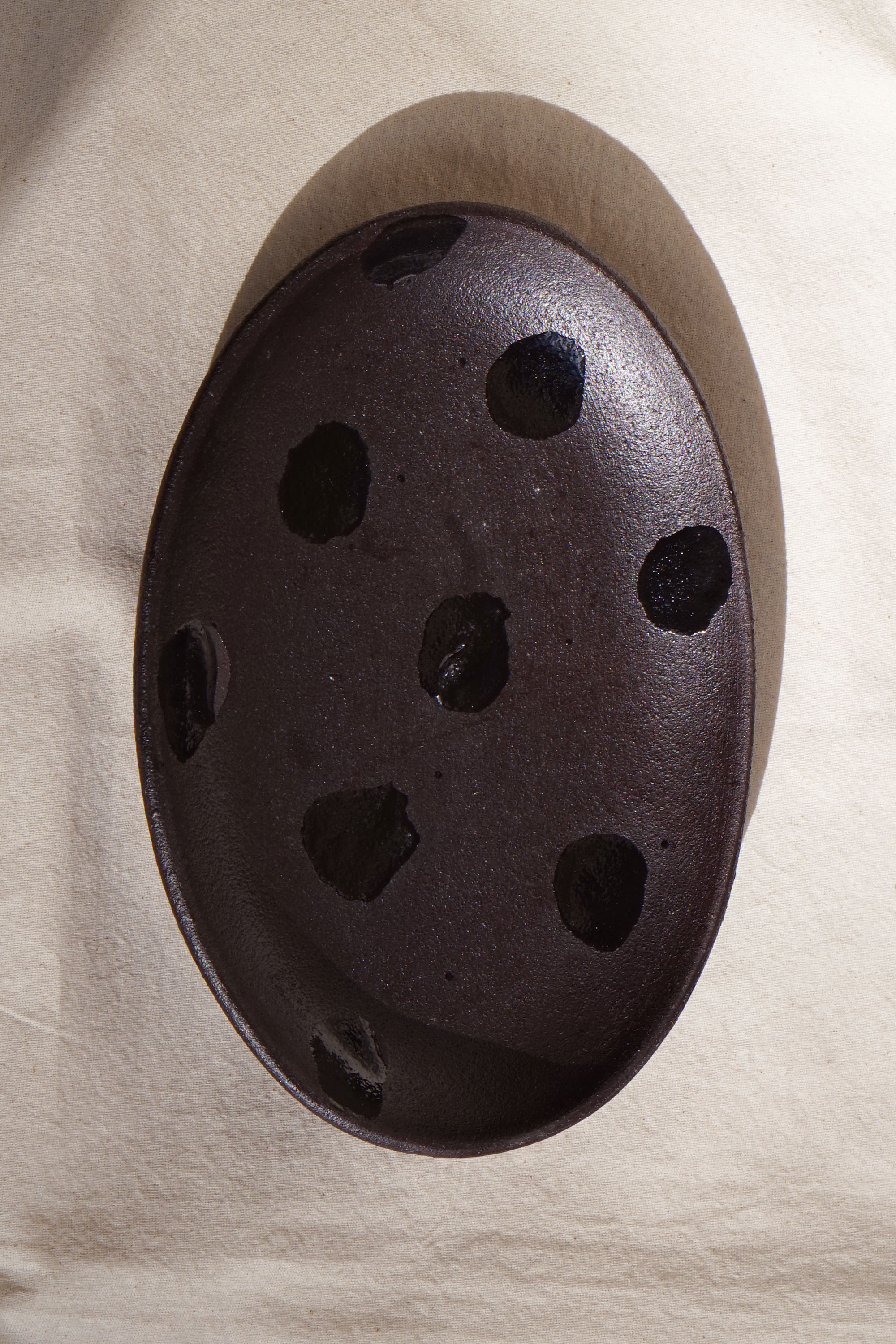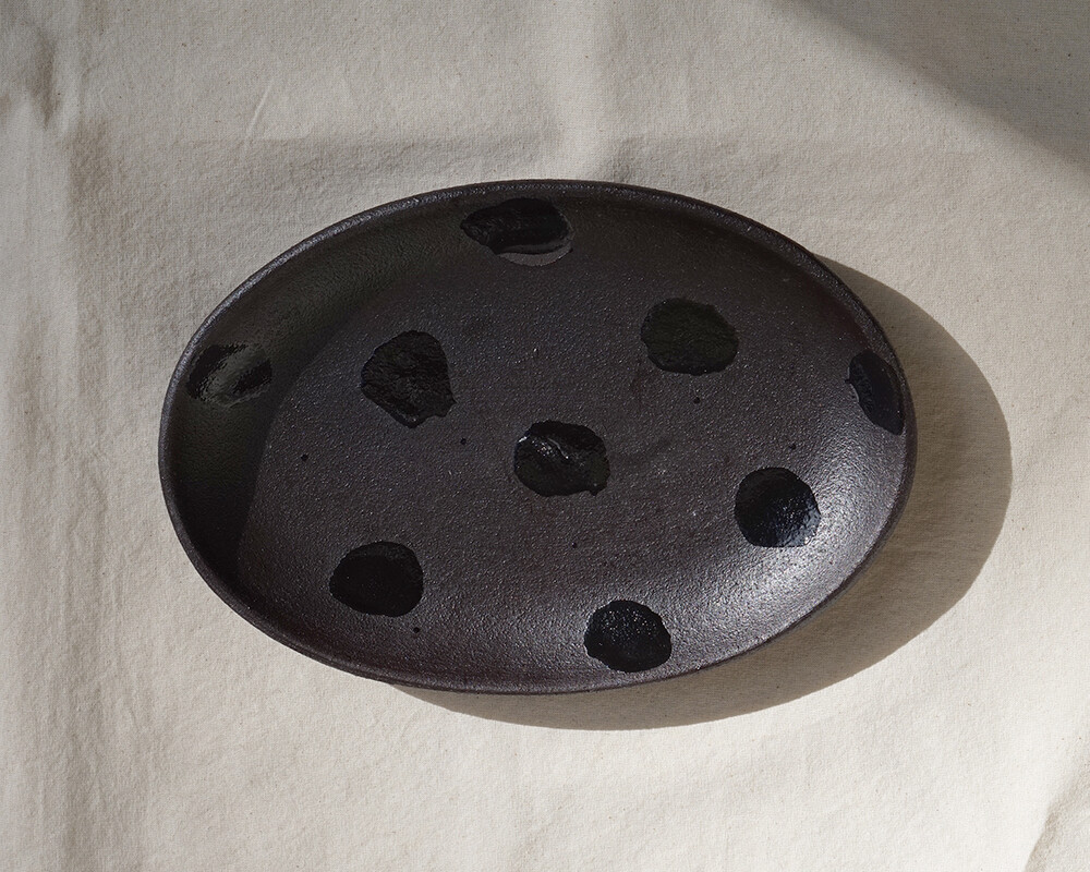 거칠고 투박한 텍스쳐 위에 붓으로 무심한 듯 그린, 하나하나 다르게 표현된 패턴이 특징인 오벌 플레이트입니다.